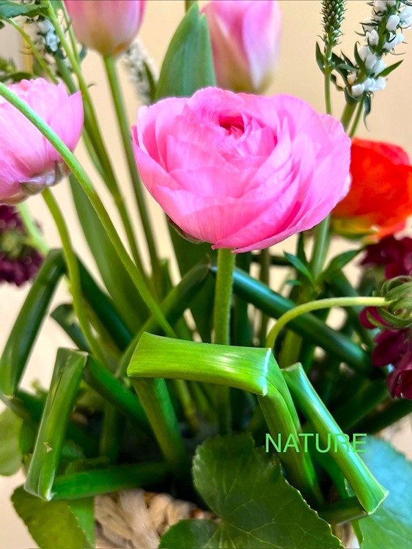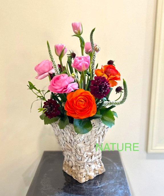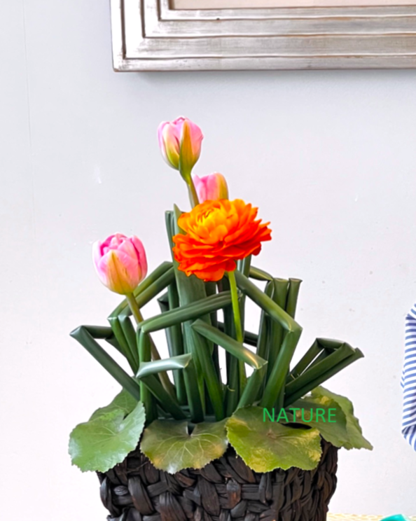 3月のナチュール『パリの花クラス』。フトイを花留めにしながら作る春のアレンジです。