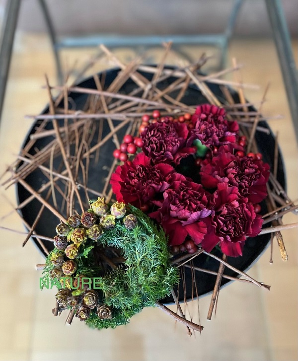 小さなマムやスプレーバラ、ラナンキュラスのシャルロットなどにダークな色の実もいれて・・・周囲は金塗のヤナギを編んで完成させた作品です。今年も様々な作品に挑戦していきましょう!