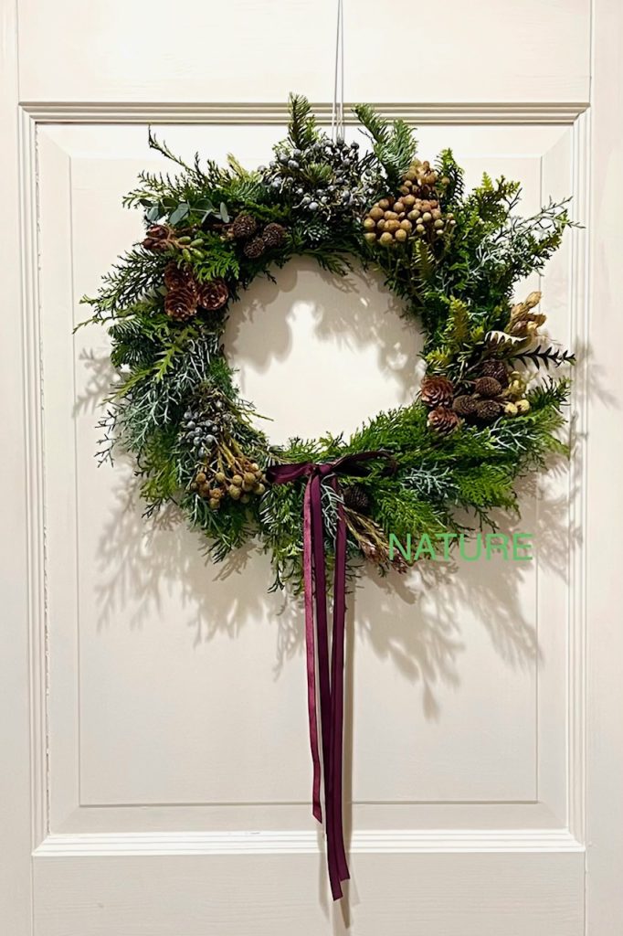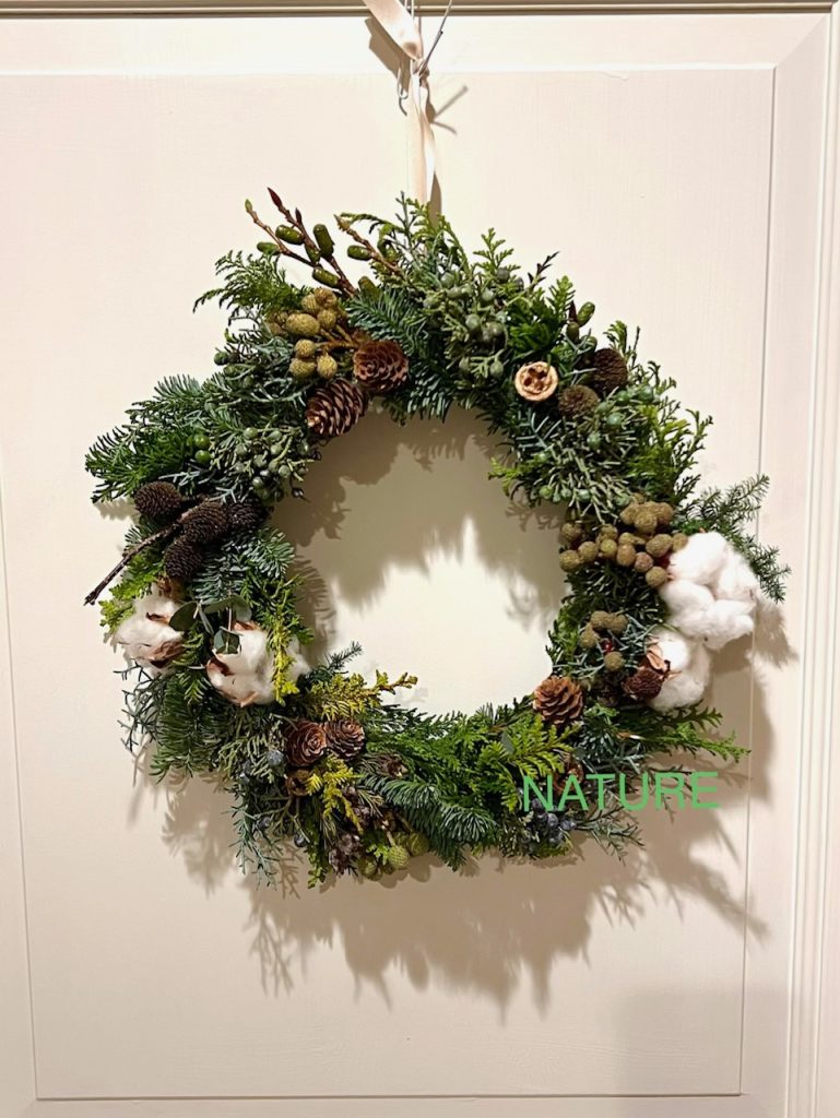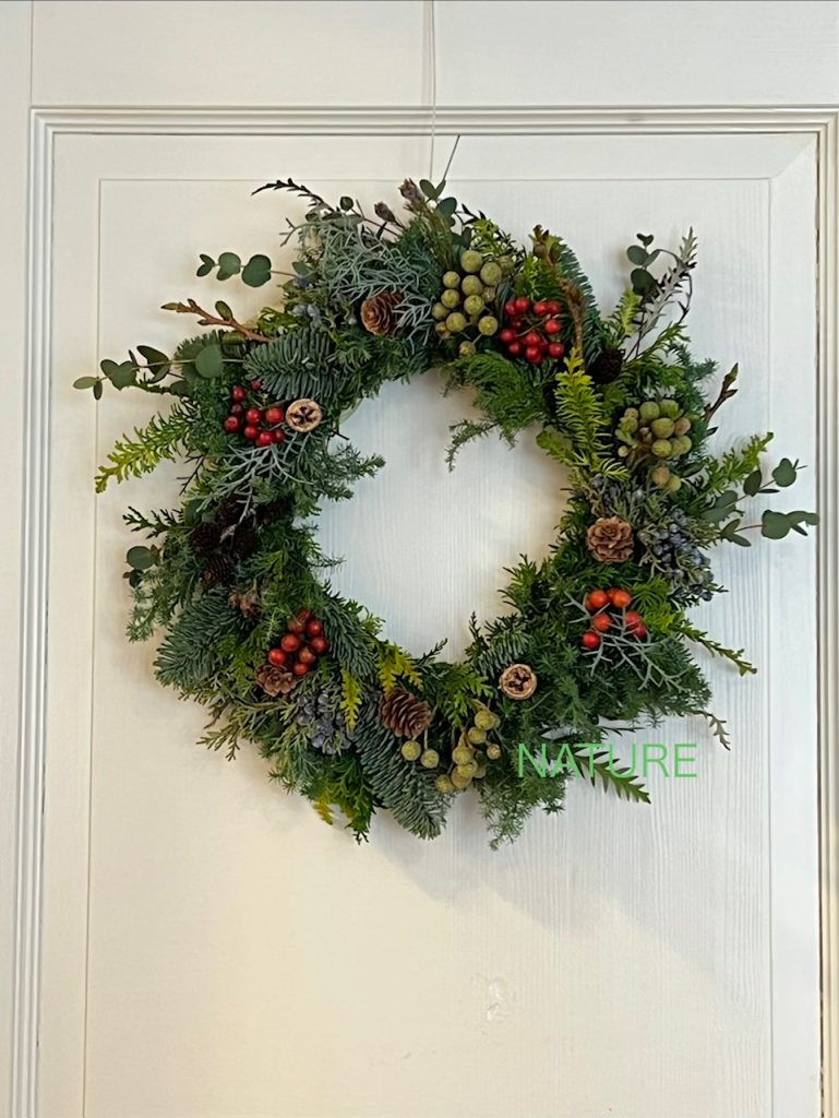 赤い実が入るとホリデーシーズンのわくわくした気持ちが高まります。毎年お作りになる生徒さんも沢山ですが、その年どしで印象の違うリースが出来上がります。