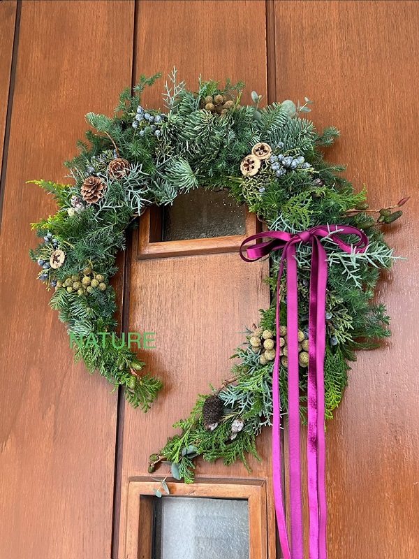 今年はいつもの円い形のリースのほかに、馬蹄型もご紹介しました。土台はシックに、そしてフーシャピンクのリボンでアクセントをつけてあります。