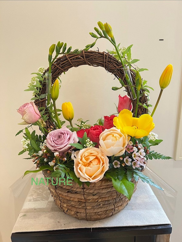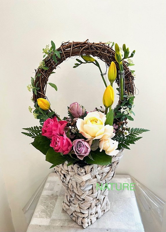 つるを編んでつくってあるリース台を使ったバスケットアレンジです。入荷が始まったコデマリやチューリップ、フリージアやバラ等々・・春いっぱい。そして所々にシリンダーを仕込んでそこにもい花をいけられます!